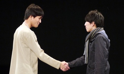 試合に先立ち,固い握手を交わしたTMjpg選手(左)とkurOa選手(右)