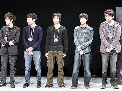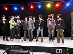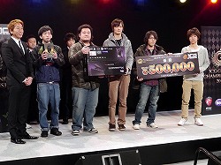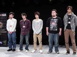 前列右からMCのコーリー氏,プレゼンターとして登壇したRazerの伊達玄四郎氏,「League of Legends」部門準優勝のVeckのメンバー。後列右から,「StarCraft II: Heart of the Swarm」実況のharuno氏,「League of Legends」実況のpapulico氏。Veckには,賞金20万円と,副賞としてRazer Goliathus small speedなどが贈られた |