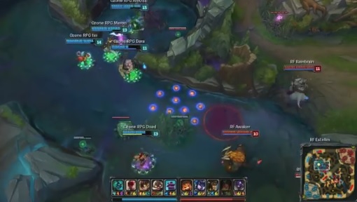 両者の対決は,中盤戦までほぼ五分の状況が続く一進一退の好勝負に。しかし途中から,RFのスキをつく形でRPGがキルを取り,そこからタワーやドラゴンといったオブジェクトを獲得。わずかなほころびを見逃さなかったRPGが,その優位を活かして勝利をものにした。