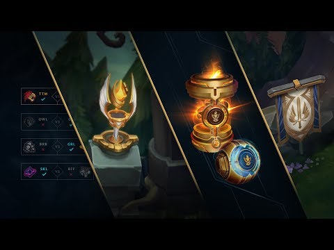 トロフィーはもっとも栄誉ある報酬です!トロフィーは各トーナメントのテーマごとに異なり、台座にはそのプレイヤーのティアが表示され、優勝したブラケットの種類に応じてジェムの色が変わります。トロフィーは、プレイヤーのサモナーズリフトのネクサスの横に2週間飾られます。