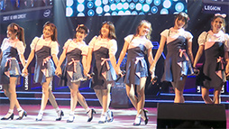 会場となったBangkok Convention Center Hallには,若いゲームファンが大勢詰めかけた(左)。初日の試合開始前には,吉本興業グループがタイで展開するアイドルグループ「SWEAT16!」によるミニライブが行われ,ファンから声援を浴びていた(右)