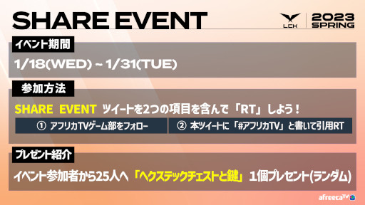 今回、「2023 LCK SPRING」公式放送の視聴と関連イベントへの参加など、詳しい内容はアフリカTVのLCK放送コミュニティ(https://bj.afreecatv.com/lckjp)とアフリカTVゲーム部(https://twitter.com/aftvgame_jp)で確認できる。