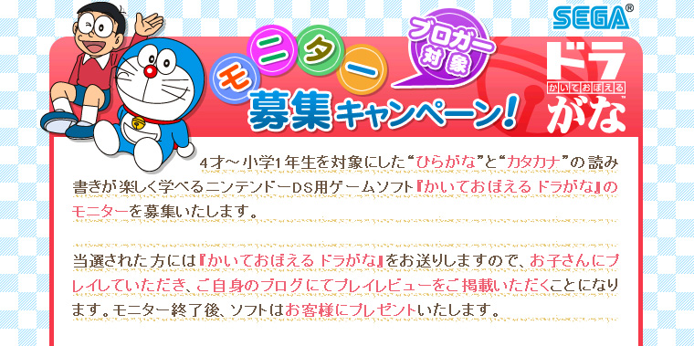 「かいておぼえる ドラがな」ブログ所有者を対象にモニターを募集