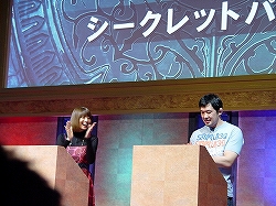 日野氏によるプレゼンテーションが終わると,本日のスペシャルゲストが登場。一人めは,柔道家・井上康生さんの妻であり,バラエティ番組を中心に活躍中の女性タレント,東原亜希さん。もう一人は,“IQレスラー”“グレイシー・ハンター”の異名をとるプロレスラー/総合格闘家で,ゲームファンとしても知られている桜庭和志さんだ。