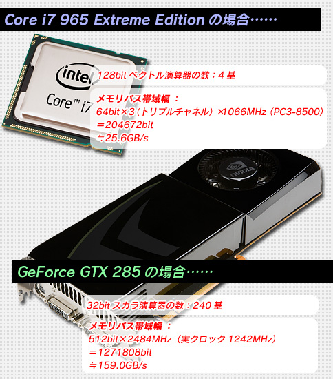 メモリシステムも,DDR3トリプルチャネルメモリコントローラを内蔵したCore i7でさえ192bit×1066MHzで帯域幅25.6GB/sなのに対して,ハイエンドGPUならGDDR3の512bit×2GHzで,100GB/sを大きく超える帯域幅を確保している。