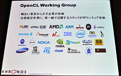 ![]() OpenCLワーキンググループ参加企業一覧。「シリコンベンダーだけではなく,ゲームデベロッパも参加している」(河西氏) |