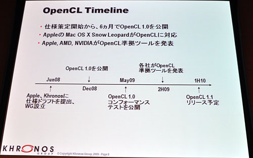 Appleからドラフト仕様が出されたのは2008年6月のことで,それから半年後の12月には,バージョン1.0が策定されたOpenCL。現在は,実際に対応ドライバやSDKといったツール群が,AppleやNVIDIA,AMDから提供され,OpenCLを利用できるようになっている状況だ。なお,今後については,「来年のSIGGRAPHまでには,OpenCL 1.1をリリースしたい」(河西氏)との見通しが示されている。