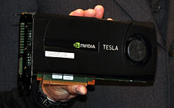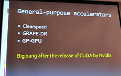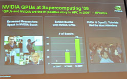 ![]() スーパーコンピュータ関連のイベント「SC」へ2007年に参加したとき,NVIDIAのGPUを使ってデモを行う会社はNVIDIAしかいなかったが,2009年には75社へと一気に増えたという |