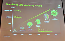 第1のテーマについて,氏はまず,「演算ニーズに対してリソースが足りない」という現状を説明する。細胞のシミュレーションを行うに当たって,1TFLOPS程度の性能だと,分子量270万のリボゾームをわずか2nsシミュレートするのに,8か月もの時間がかかったりするとのことで,「高度なものを計算するにはより高い演算性能が求められる」(Huang氏)わけだ。