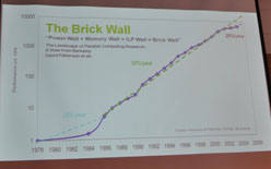 このような形で演算ニーズが高まる一方で,スーパーコンピュータの世界では,1986年から2000年頃までは年率平均52%ほどの性能向上が実現されてきたのが,それ以降は,同20%程度になってしまった,という事例を氏は挙げる。「仮に,年20%程度の伸び率に留まると,2016年には,年52%の伸び率をしたときと比べて,パフォーマンスは1000倍も差がついてしまう」としたHuang氏は,これを失わないためにも,新しいアーキテクチャ――GPGPUが求められるとした。