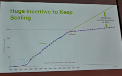 Huang氏は,FermiアーキテクチャのTeslaやGF100が30億トランジスタを集積したことを挙げて,これが,300万トランジスタを集積して1995年に発表された「RIVA 128」の1000倍,性能は1000倍以上に到達したことを指摘しつつ,次のように述べる。