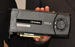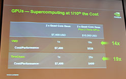 例えば,2基のクアッドコアXeonを搭載したシステムが7400ドルだとして,ここに2基のTesla GPUを加えて1万ドルのシステムを構築すると,分子動力学のシミュレーション性能は19倍,分子モデリングのシミュレーション性能は25倍に引き上げられるという。また,パフォーマンス当たりのコストはそれぞれ14倍,19倍も優れているとのことだ。
