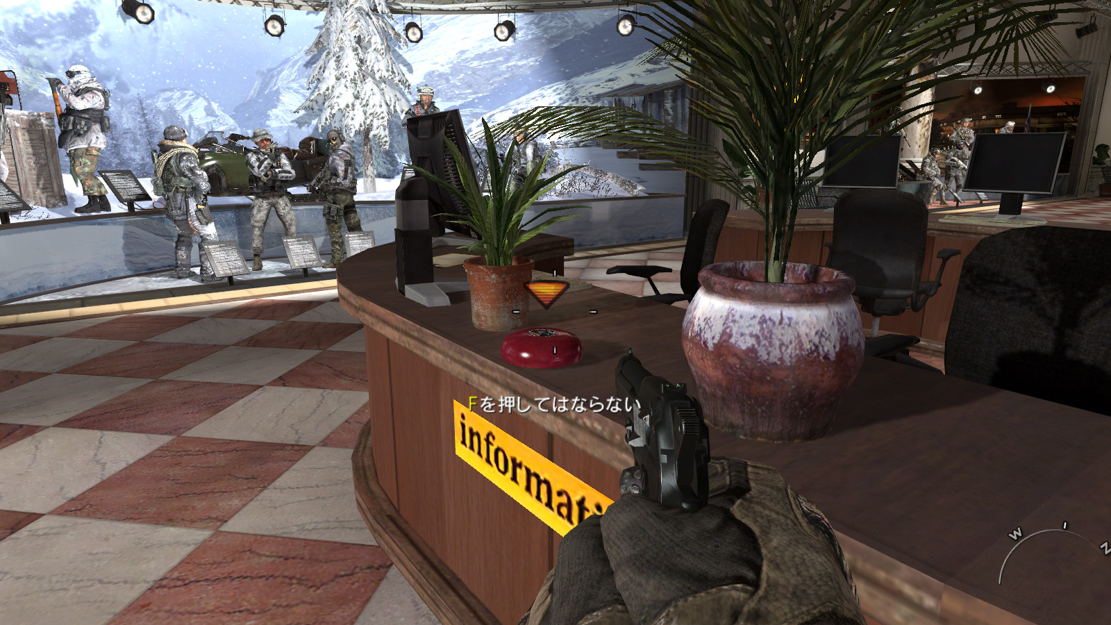 そんな博物館のカウンターには,「押してはならない」と書かれた赤いベルがある。禁じられると,したくなるのが自然の摂理……。だが,ポチッと押すと大変なことになるのだ。書かないけど。ちなみに,この博物館にはゲームに登場したすべての武器が納められており,しかも自由に手に取ることができ,弾薬まで用意されている。こんな博物館あってたまるか!