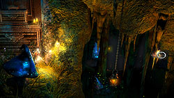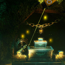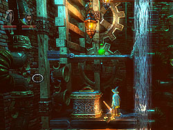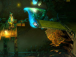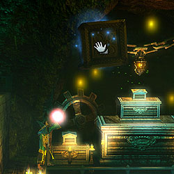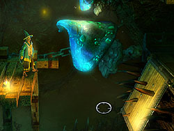 この物理演算エンジンはゲームの肝である,謎解きにもふんだんに利用されている。観覧車のような乗り物におもりを載せて回転させ,その勢いを利用して高所に飛び移ったり,左右に大きさの異なる岩がぶら下がった板の上に,さらにおもりを置いて,シーソーのように片側を持ち上げて通り抜けたり,といった具合だ。このように,物理法則に従って動くオブジェクトがステージのいたるところに用意されている。一見不可解でも,プレイヤーが干渉することで仕掛けを突破するヒントを得られることもあるので,怪しいものを見つけたら,「これはどんな動きをするんだろう?」と攻撃してみたり魔法をかけてみたりするといいだろう。