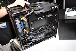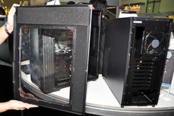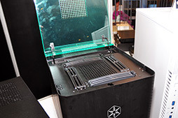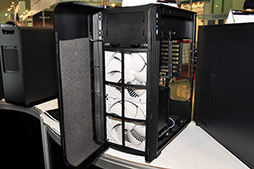 Fortress FT03」は“米びつ”のような形で異彩を放っていた。そして今回のテーマは,「拡張性と冷却性能を追求しつつ,徹底的な静音化も図る」(SilverStone)。要は静音仕様のPCケースというわけで,前面を覆う大きな扉や左右両側板,底板,天板に吸音材が貼られているのが大きなポイントだった。