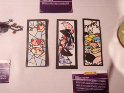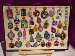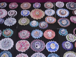 | 切り絵のしおり(左写真)と,勲章(右写真)。制作物のジャンルも実に幅広い | |