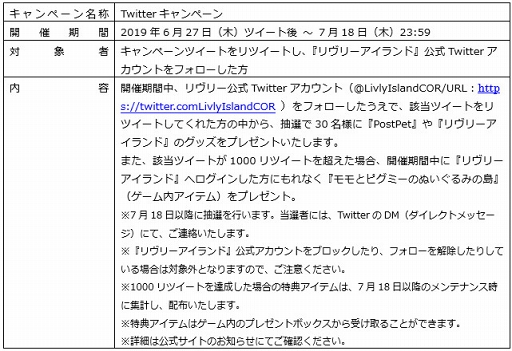 GMOインターネット株式会社が運営するブラウザゲーム『 Livly Island(以下、リヴリーアイランド)』は、本日2019年6月27日(木)から7月18日(木)までの期間、『PostPet』とのコラボレーションイベントを開催いたします。また、この期間中に新規で『リヴリーアイランド』に登録いただいたユーザーや、復帰したユーザーを対象としたキャンペーンも開催いたします。ぜひご参加ください!