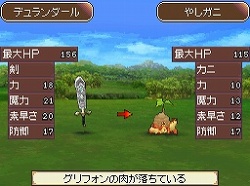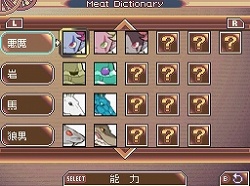 ![]() どの肉を食べると何に変身するかが2画面で一目瞭然。変身前と後のステータスの違いも容易に確認できる |