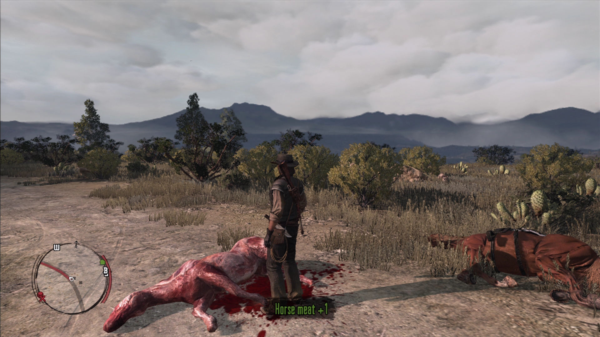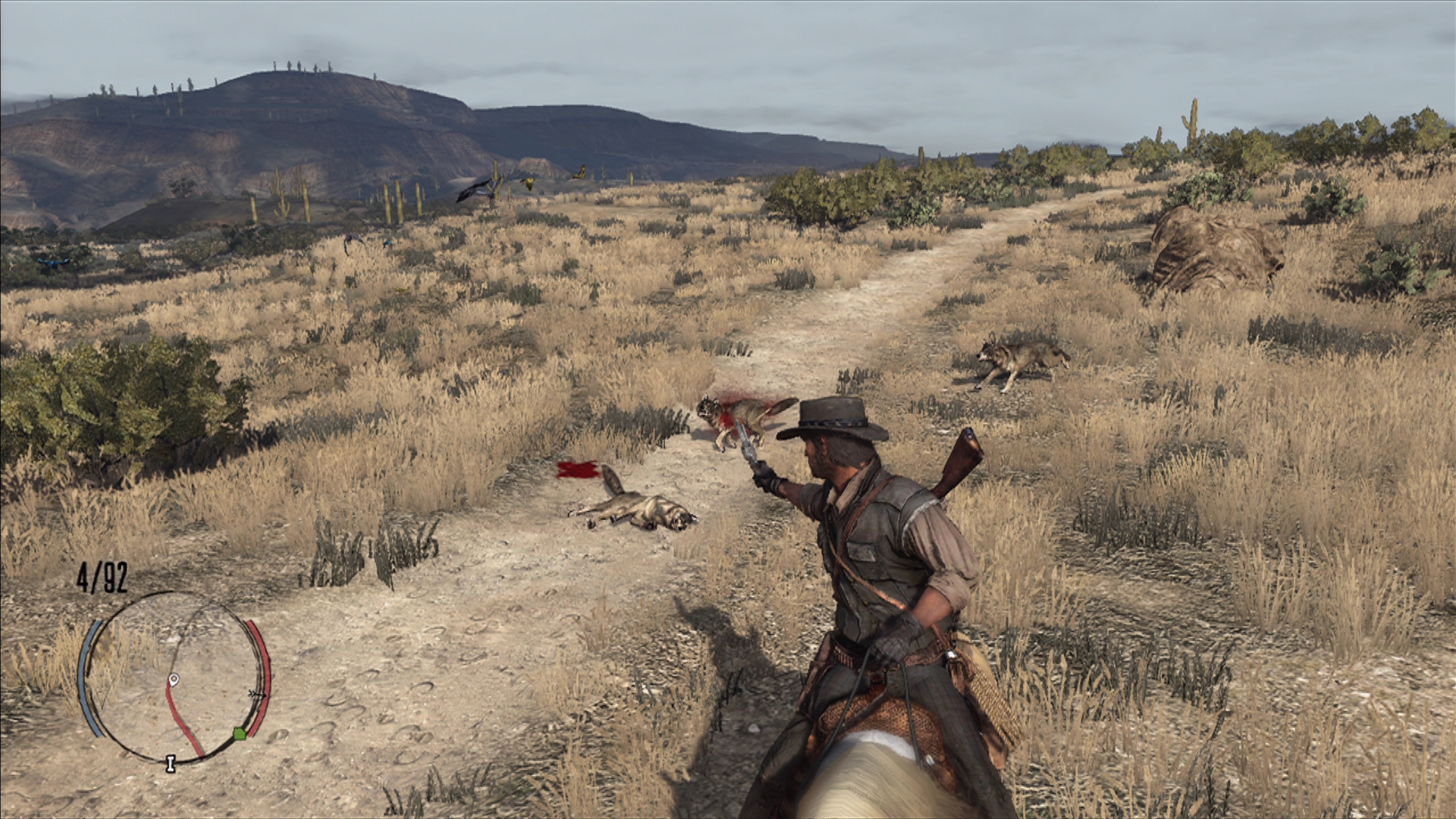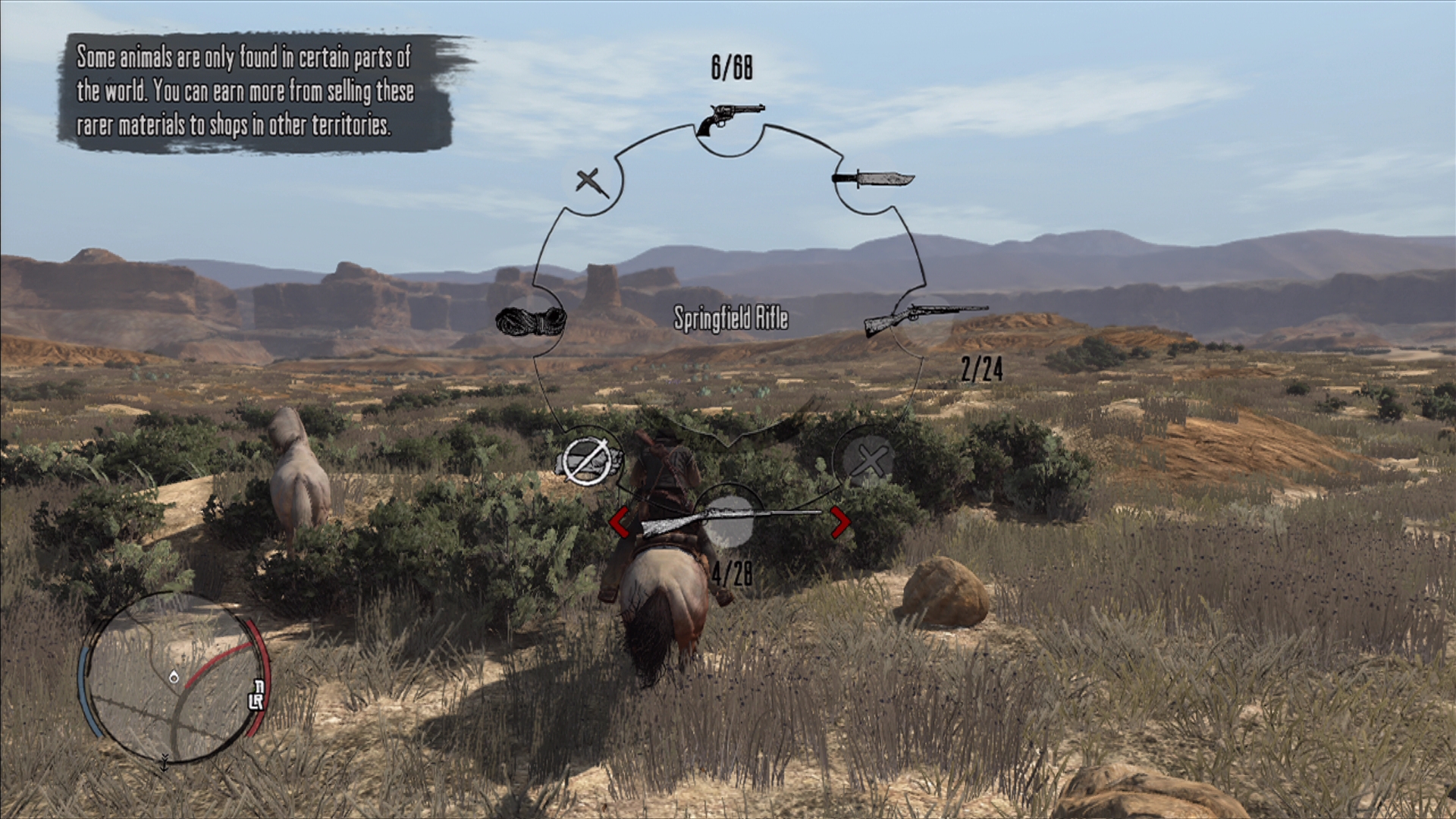 荒野には人を襲う悪党達のほかに馬,鹿,スカンク,兎,ガラガラヘビ,鷹などの野生動物が生息しており,狩猟して得た皮や肉を売ることで,お金が得られる。このお金で銃やアイテムなどを購入できるのだ。そのため,動物を見かけるたびに追いかけ,ナイフで解体して皮や肉を調達するなんて,狩人みたいな生活を送ることもできる。マタギのジョンだ。