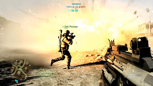 ゲームの舞台は,プレスカンファレンスで紹介された砂漠のマップ「Tacoma Desert」で,吹き飛ぶ戦車や上空を駆けるヘリコプターなど,思わず,これを撮ったEA DICE関係者の苦労がしのばれる内容で,何度見ても飽きない。うーん、カッコいい。
