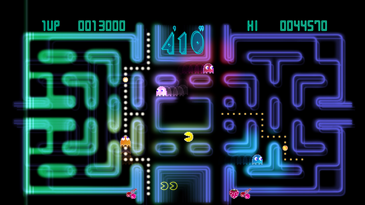 センターで折り返す形のゲーム画面になっており,見た目はちょっと変わっているものの,基本的なゲーム性はオリジナル譲り。片側のクッキーを食べ尽くすと反対側にフルーツが出現。これを繰り返して制限時間内に最高得点を目指すのというもので,ベテランゲーマーならずとも,新しいパックマンの姿を一度見てみよう。