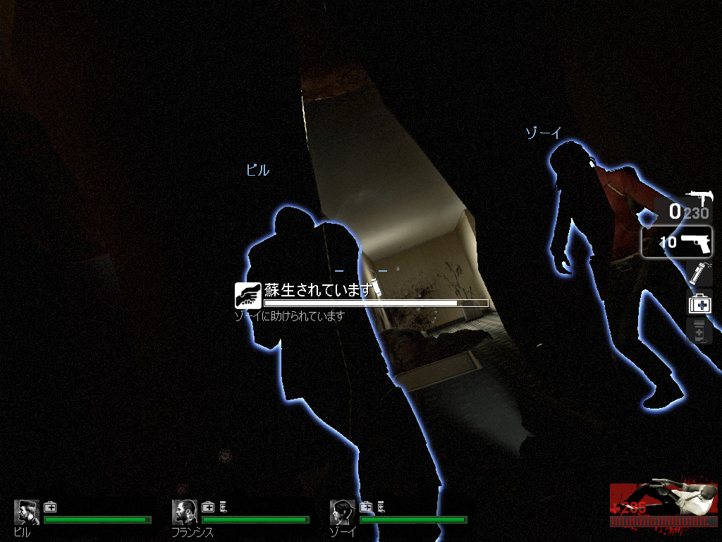 また,途中で倒れたプレイヤーに対するケアがしっかりしているのも特徴だ。ライフゲージがなくなっただけなら,ほかのプレイヤーに「救助」してもらえばゲームに復帰可能(回数制限はあるが)だし,救助が間に合わなくて死んでしまった場合も,やがて「新たな生存者」として復帰できる。