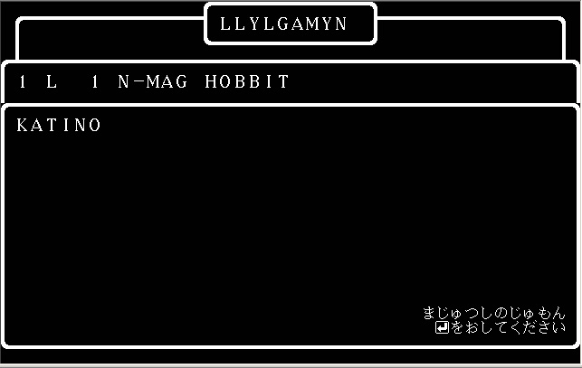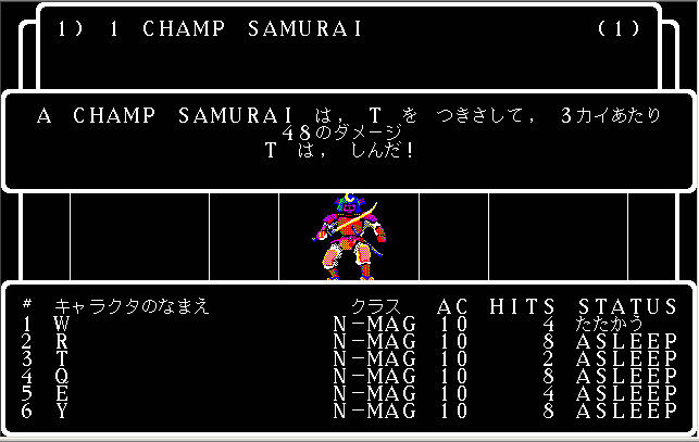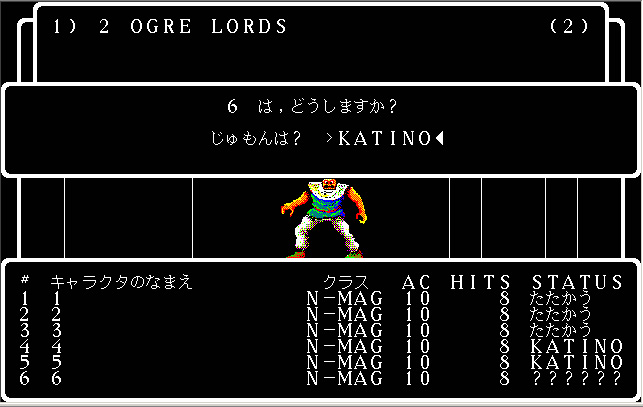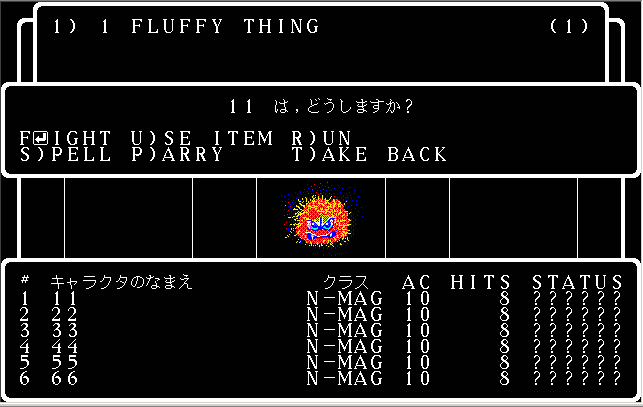 しかし次のパーティは,別の問題に遭遇した。作成されたキャラクターのうち1名が,攻撃魔法であるHALITOを覚えておらず,敵を眠らせる補助魔法,KATINOしか持っていなかったのだ。先制してKATINOで眠らせるという一種のCC(Crowd Control)はウィザードリィの基本だが,敵とのレベル差が大きすぎるのか,それとも敵のレベルが高すぎるのか,まるで眠りゃしないのである。