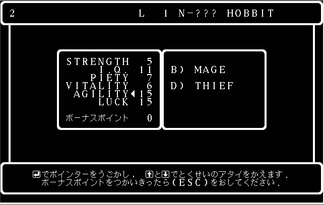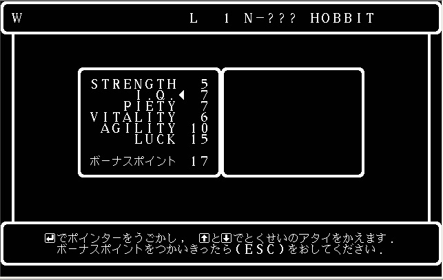 ウィザードリィ IIには人間,エルフ,ドワーフ,ノーム,ホビットという5種族が存在するが,この中でもっとも先手をとりやすい能力値を備えているのがホビットである。最終的には成長してすべての能力値が上限値である18になるのだが,おそらくその大半が成長の「せ」すらしないであろうと予測される以上,「作ったその日から素早い」ことには重要な価値がある。