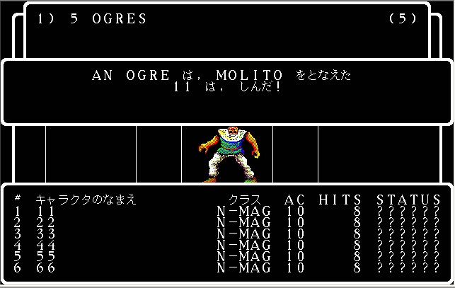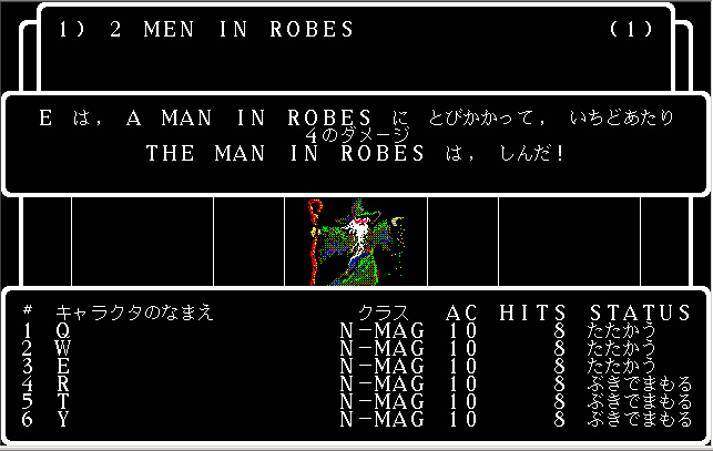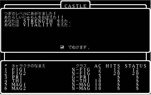 その後も,1対6だの2対6だのを繰り返し,毒を受けて即死したり,麻痺したレベル1メイジのデータをそっと削除したり(麻痺の回復には費用が必要なので),やっぱり全滅してみたりしながら,それでもついに「MAHALITO」(序盤における切り札的な範囲魔法)が使えるメイジが誕生したのだ!