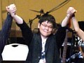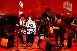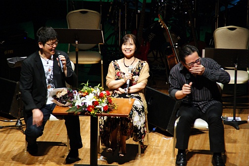 続いて,ギタリストの太田光宏さんもステージに登場し,三人でのトークへ。これまでの音楽活動を振り返った思い出話から,なぜか太田さんの家庭環境にまで話は広がり,「部屋でレコーディングをしていると知らない間に息子が入ってきて『お父ちゃんヘタやなぁ』と言われる」というエピソードを語っていた。