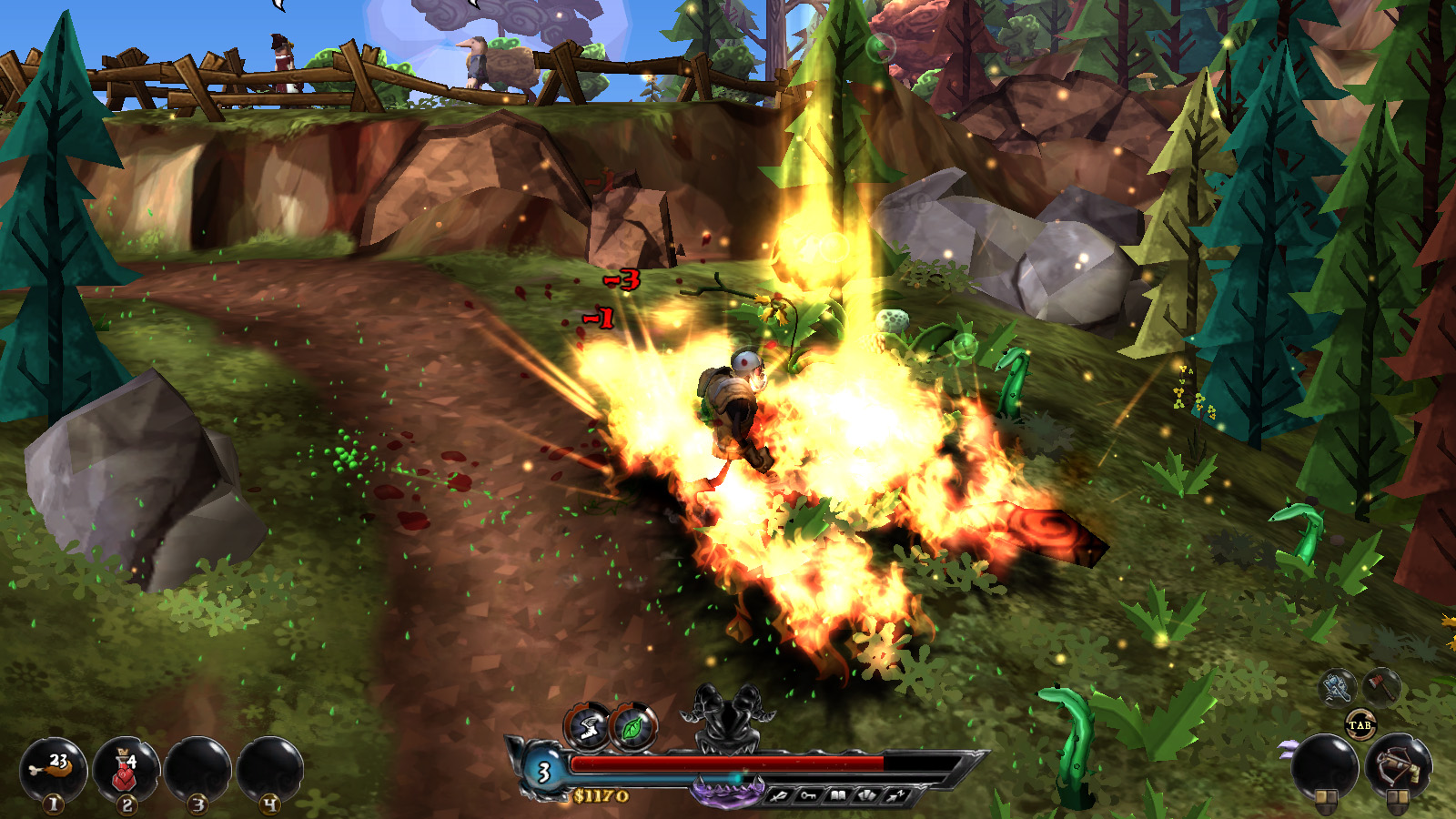 掲載したスクリーンショットからも分かるように,キャラクターにはコミカルなデフォルメが施され,リアルさを追求した最近のアクションRPGとは一線を画している。独特のタッチで描かれたキャラクターはかなりアクが強く,主人公のDeathSpankからして,樽のような胴体にヒョロっとした手足,勇者というよりヒールを思わせる顔つきになっている。