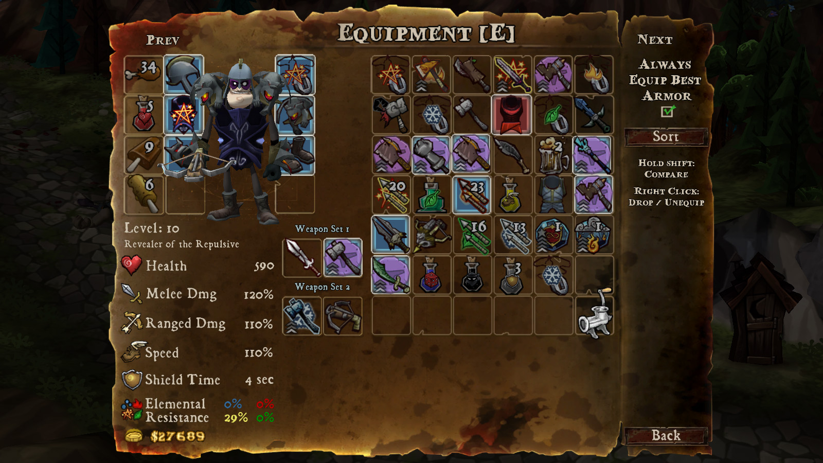 見かけが悪人で,傲慢な物言いをする勇者DeathSpankだけに,あまり愛情こめて育成する気にはならないかもしれないが,仮にも主人公なのでそこは我慢してあげよう。