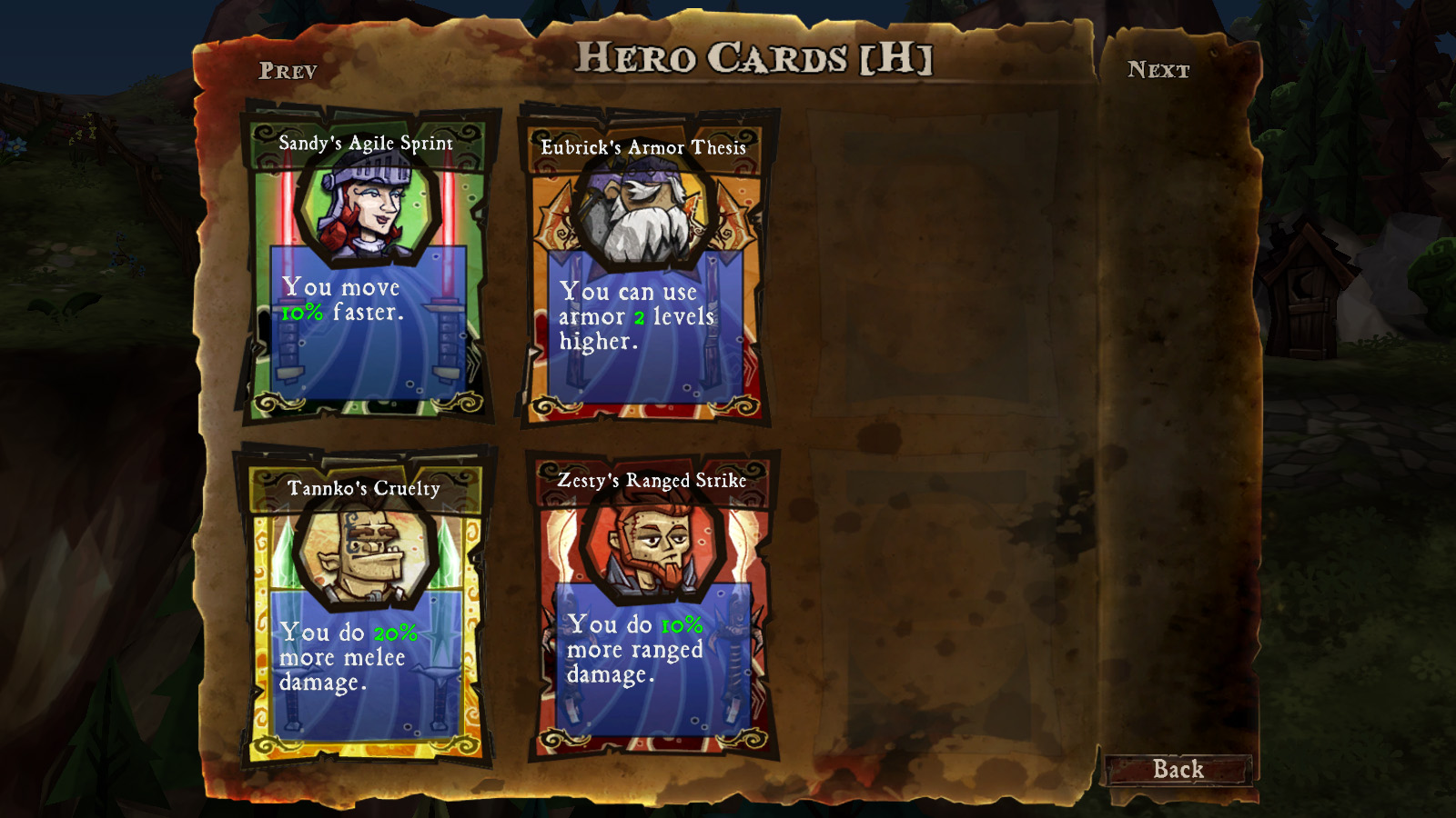 経験値を貯めてレベルアップすると,ヒットポイントや能力値が上昇するのはおなじみの仕様だが,本作の特徴として,「ヒーローカード」なるものが一枚もらえる事が挙げられる。ヒーローカードには,移動速度をアップしたり,防御力を増したりといった効果がついており,レベルアップ時に3枚の中から1枚選べ,このヒーローカードを使って,自分なりのオリジナルDeathSpankを育てていけるわけだ。