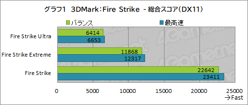 1つめのテストは,3DMarkにおけるDirectX 11テストである「Fire Strike」の総合スコアとなる(グラフ1)。
