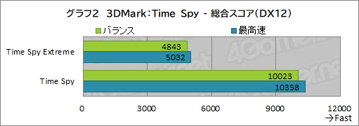 2つめのテストは,3DMarkにおけるDirectX 12テストである「Time Spy」で総合スコアを計測した。スコアをまとめたのがグラフ2となる。