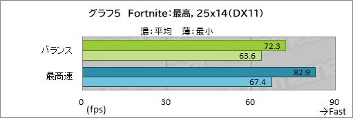 まずはベンチマークレギュレーション24から,Fortniteをテストしてみた。テスト解像度は2560×1440ドットで,グラフィックス設定は「最高」で計測している。その結果はグラフ5のとおり。