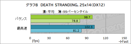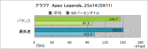 バランスでも平均フレームレートは約99fps出ており,最小に当たる99パーセンタイルフレームレートでも約79fpsと,安定して快適なプレイができることは明らかだ。最高速とバランスの差は3〜3.7%程度と,Apex Legendsよりは差が小さくなった。