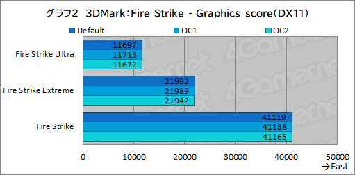 まず,GPUテスト結果から見ていくと,やはりDefaultとOC1との差は1%にも届いておらず,スコアはキレイに並んでいる。それは,OC2でも変わらず,やはりオーバークロック設定はGPU性能にあまり影響がないようだ。