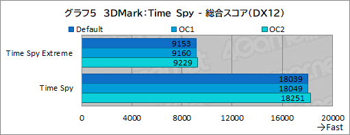 ここでは,Fire Strikeよりもオーバークロック設定の影響が見られなくなった。DefaultとOC1との差は1%にも満たず,OC2でようやく約1%に達する程度と,スコアに大きな差は確認できない。