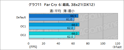 ただ,OC1と02,それにDefaultで比較すると,その差は1fpsに達しておらず,オーバークロック設定は影響しないことが分かる。
