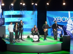 The Beatles: Rock Band」(Harmonix/MTV Games)。これは,伝説のバンド,ザ・ビートルズとリズムアクション「Rock Band」がコラボレーションしたタイトルだ。多くの人に馴染み深いビートルズサウンドと,ゲームのために新たに制作された映像に合わせて,ギター/ベース/ドラム/マイク(ボーカル)それぞれの専用コントローラーを使ったデモンストレーションが行われた。