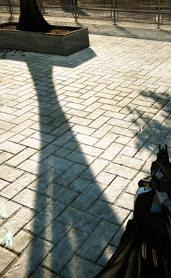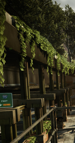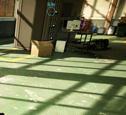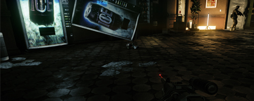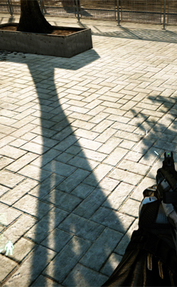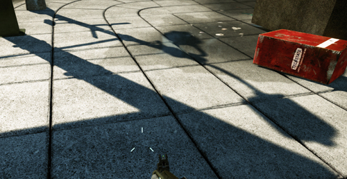 DirectX 9版Crysis 2では一様にソフトシャドウ処理をして影の輪郭をボカしていたのだが,DirectX 11版Crysis 2では,影の投射元となっているオブジェクトに近い位置では輪郭をくっきりと描き,投射距離が長くなればなるほどボケ具合を強くするようにしてある。現実世界でも,線光源や面光源のような大きさのある光源によって生成される影はその投射距離に比例してボケ具合が強くなるし,無限遠からの平行光源や大きさのない点光源であっても,光散乱などにより,投射距離の長い影のほうがボケは大きくなるから,現実に即したボケ方をするようになった,といったところだ。