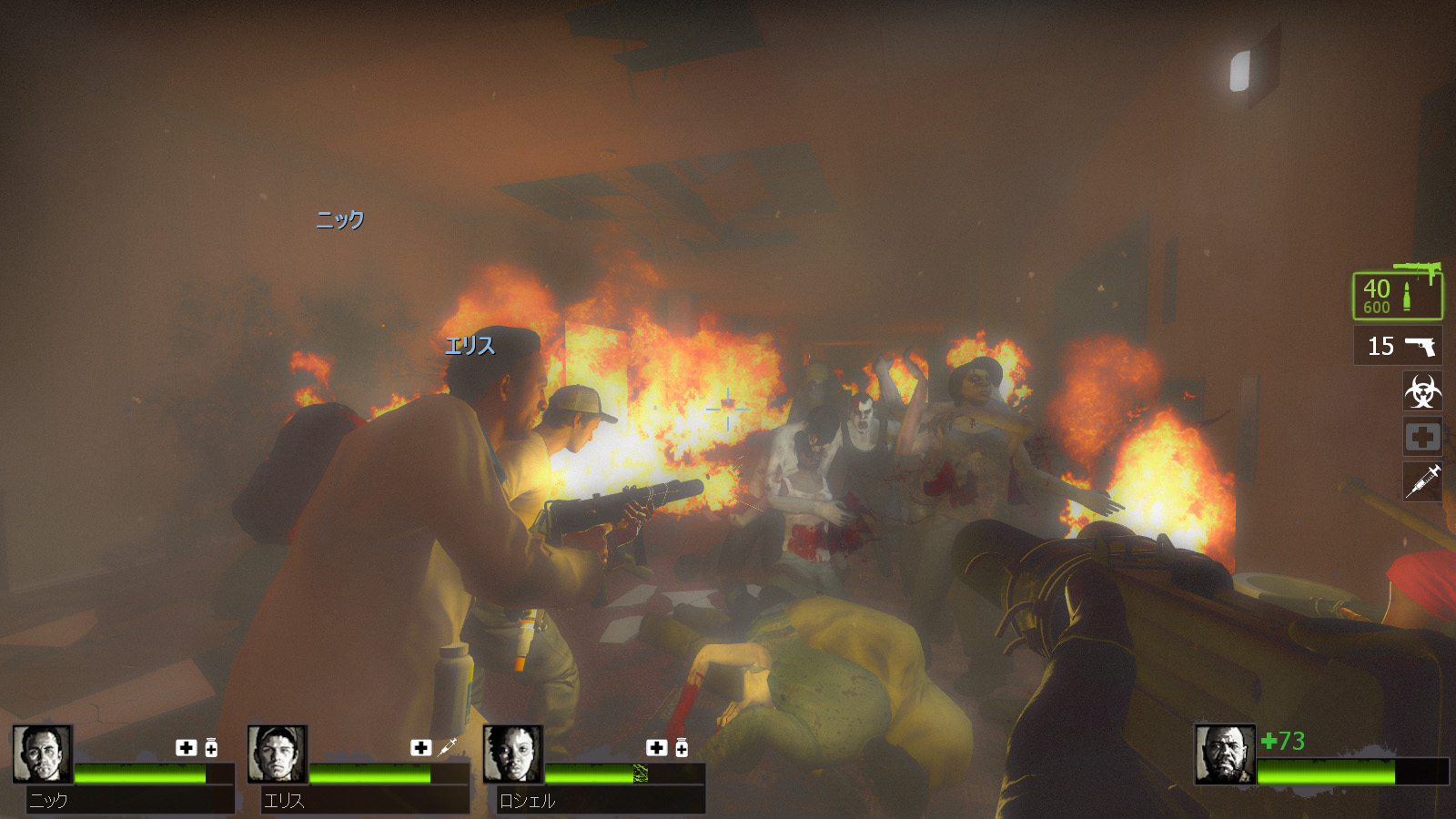 4人が屋上まで辿り着いたビルは,火の手が上がっているホテルだった。スタート地点の屋上には,救急キットや数種類の近接武器などが置かれているが,サブマシンガンやショットガンといったメイン武器は置かれていない。心許ないが,とりあえずの準備ができたら先に進もう。