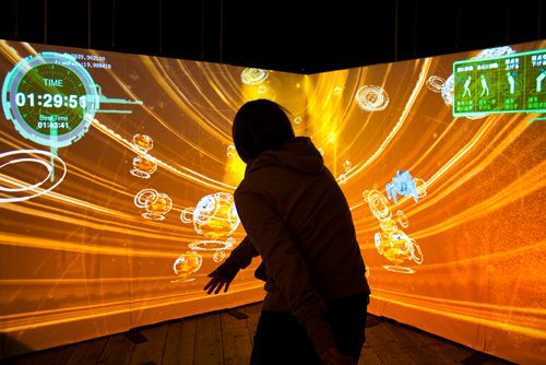 今回制作した電脳空間は、部屋全体にインタラクティブな“電脳空間映像”を投影いたします。体験者は、空間内に常駐する「タチコマ」(※1)の指示により時間内に電脳空間を飛び回る「タチコマ」をつかまえるミッションに参加します。電脳空間では体験者のボディアクションをKinectセンサで感知し信号化することで、電脳空間を自由に移動する操作を提供します。結果、「攻殻機動隊 S.A.C.」シリーズの舞台となる電脳空間を泳いでいるかのような感覚を得られます。来場者は自身のボディアクションにより電脳空間を操作して遊ぶことができます。