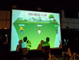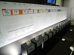 ![]() 25年のFFシリーズのナンバリングタイトルのパッケージが並ぶ。その後ろにはヒストリーボードと,作品ごとのダイジェスト映像が上映されていた |