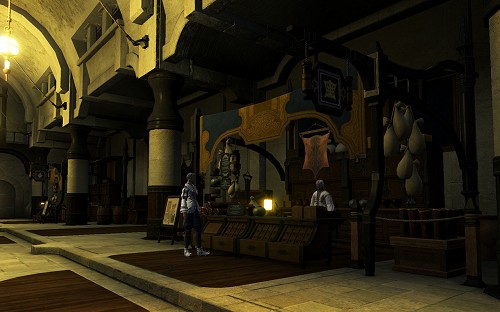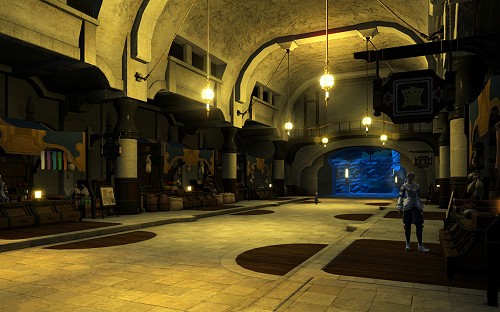 アーケード街の一角を占める輸入品の市場。隣国ウルダハやグリダニア出身の職人向けに,道具や材料を取り扱う店が軒を連ねる。また別の一角には,場代を納めた冒険者達が自ら作った製品や獲得した戦利品を売買する「刀剣街」や「魚河岸」といった通りもあり,彼らに雇われた従業員(リテイナー)の売り声が飛び交い,活気に満ちている。