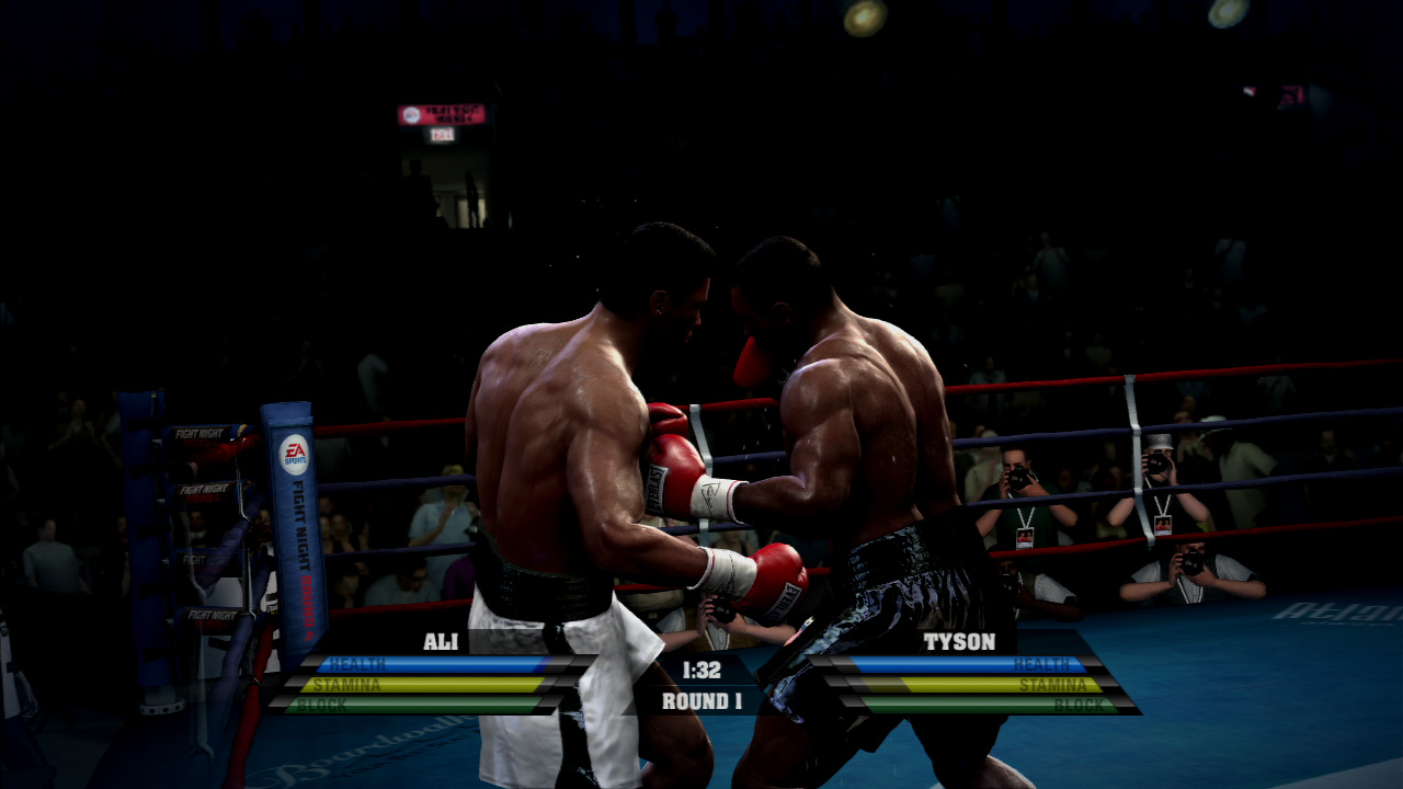 試合の様子は非常にリアルである。物理エンジンによる衝突判定が行われているため,ボクサー同士が重なることはなく,不自然なシーンはまったく見られない。パンチがはずれれば,おたがいの腕がもつれ,相手のガードを下から打つとほんのわずか,ガードが上にずれる。パンチが当たるたびに汗が飛び,ラウンドが進むごとに選手の顔が腫れていく。