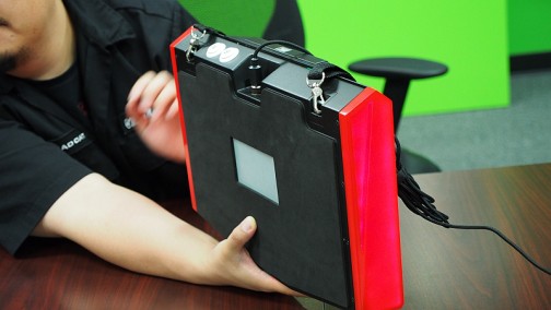 アーケードスティックの開閉機構と言えば,Razer Atroxで採用されたのが記憶に新しいが,TE2にはAtroxにあった天面を支える“つっかえ棒”がないのがポイント。とはいえ,ヒンジ部は「ノートPCなどで使われる機構がそのまま用いられている」(Mad Catz)とのことで,中途半端な角度でも固定できるようだった。