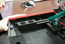 またボタンの裏側には,発光用のLEDユニットが,ボタンの裏側からはめ込まれているのも見て取れた。こちらは,クリアカバーを取り外したうえで,ボタンに接続されたファストン端子を外せば,取り外しも可能とのことだった。