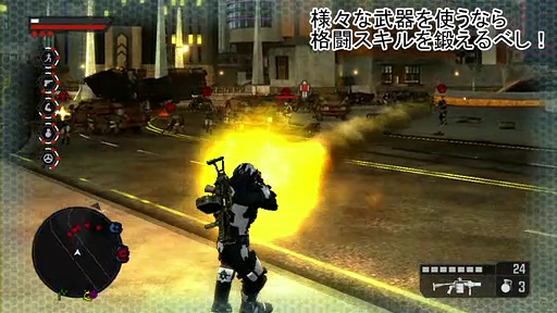 例えば,交差点で苦戦している仲間を助けようと,再広範囲のクラスター爆弾を放り投げようものなら,仲間だけでなく,そこから数メートル離れた距離にいる自分も爆死確定だ。また,格闘スキルを伸ばしていると習得できるグランドストライクという技を繰り出せば,その技の衝撃波の範囲内の敵だけでなく,味方にも大ダメージを与えることができる。